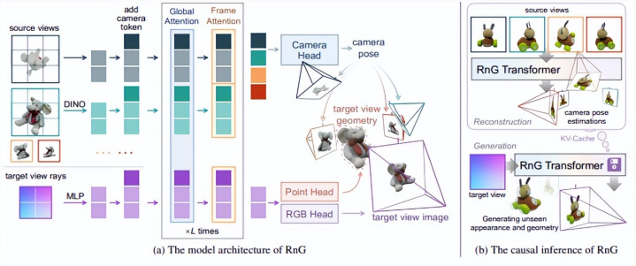 论文简介:RnG (Reconstruction and Generation) 通过单一 Transformer 架构统一了3D 重建与新视角生成,为高动态、高一致性的视觉任务提供了新范式 。在视频生成领域,传统扩散模子虽能产生高超的视频已矣,但常因穷乏底层3D 驾御导致物体在透露中发生形变 。RnG 期骗重建教导的因果提神力机制,确保生成的系数视角都严格解雇合并套隐式3D 表征 。 其推理速率比扩散模子快100倍以上,可在0.1秒内完成单帧生成 。这意味着它能手脚视频生成管线中的“及时几何底座”,为模子提供极速且空间一致的参考帧,透顶惩办视频精明与结构崩坏问题 。RnG 赋予了普通电商卖家“造谣3D 扫描”的技艺,无需高亢的扫描开辟或复杂的影相位姿校准,只需期骗手机顺手拍摄几张商品相片,RnG 即可推断出物体完整的3D 几何与纹理。借助其高效的 KV-Cache 渲染本事,电商平台不错收尾丝滑的360° 商品环绕展示或 AR 试穿试戴,让消耗者在毫秒级蔓延下从苟且视角查看商品细节,极大提高革新率并裁减退货率 。