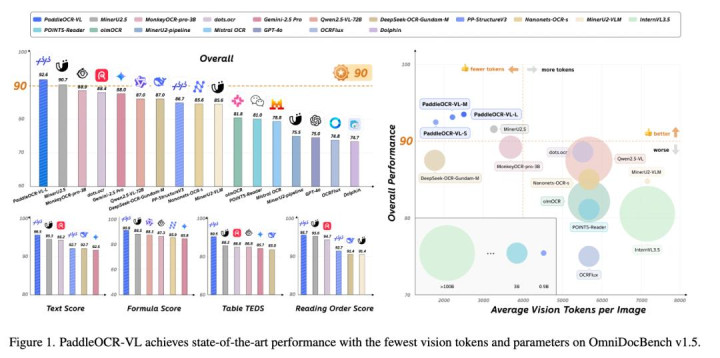 (右侧)PaddleOCR-VL 的三个版块(S, M, L)一齐位于图表的最左上角(“黄金区域”)。这意味着它以极少的视觉 Token(每每唯有竞品的1/3到1/2)和更小的模子参数,收尾了比72B 等其他大模子更高的文档解析精度。