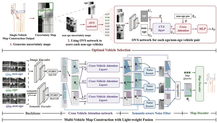 论文简介:本文建议 OptiMVMap,将多车协同建图建模为“先优选、相遇通”的新范式,突破单车轨迹视角受限导致的荫庇与拓扑缺失问题。中枢翻新在于:一是缱绻不笃定性感知的最优车辆遴荐(OVS)模块,从候选车辆中筛选最能补充自车盲区的少许视角,在显赫裁减臆想支出的同期幸免冗余共线视角;二是建议跨车提神力(CVA)与语义感知噪声过滤(SNF),收尾对位姿过失与荫庇伪影的鲁棒对皆与阻挠,从而在 BEV 层完成高质料会通。比较肤浅堆叠多车数据,该方法以更少视角赢得更完整、拓扑更准确的矢量化舆图。在 nuScenes 与 Argoverse2上显赫提高 mAP,考据了不笃定性教导遴荐在高精舆图构建中的要津价值,具备面向范畴化自动驾驶与众源建图系统的本色应用后劲。