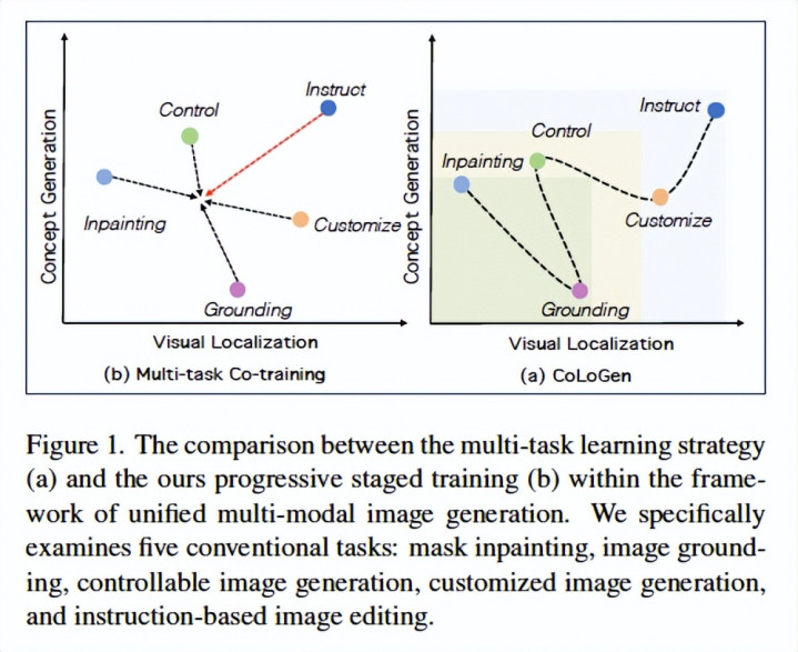 论文简介:本文建议统一扩散生成框架 CoLoGen,惩办多任务图像生成中宽广存在的“观点-定位表征冲突”:如 inpainting /个性化生成更依赖语义观点相识,而可控生成/grounding 更依赖空间定位精度,径直多任务连络测验会导致性能彼此干扰。CoLoGen 接受“由易到难的渐进式课程学习”,先通过 mask inpainting 与 grounding 诀别竖立观点生成与定位技艺,再彭胀到深度/角落/分割等多条目适度,最终在指示裁剪与个性化生成中会通两类技艺。中枢翻新模块为 PRW(Progressive Representation Weaving):通过动态路由遴荐轻量行家网罗(KV 投影行家),并引入 Veteran Gate监督肃肃行家分拨,从而冉冉“编织”观点与定位表征,收尾统一模子在裁剪、适度生成、个性化生成等任务上取得优于或可比 SOTA 的效果,在面向统一的图像生成/裁剪等卑劣任务中具备较大后劲。