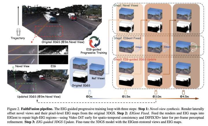 为了惩办这些问题,咱们引入了 FaithFusion,这是一个由像素级盼愿信息增益(Expected Information Gain, EIG)开动的3DGS-扩散模子 会通框架。EIG 手脚连贯的时空合成的统一政策:它教导扩散模子手脚空间先验,去细化(优化)高不笃定性的区域;同期,它通过像素级加权将裁剪的内容索要(蒸馏)回3DGS 中。