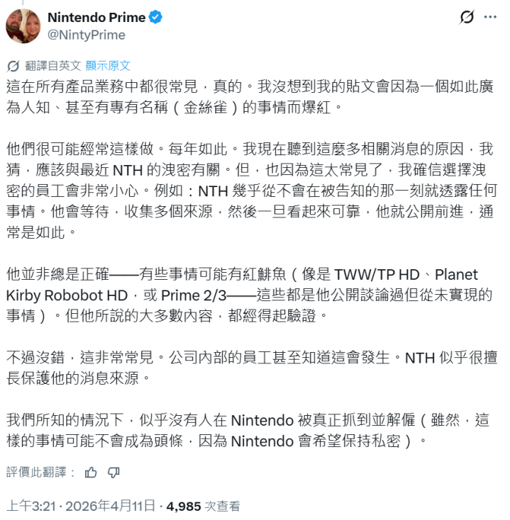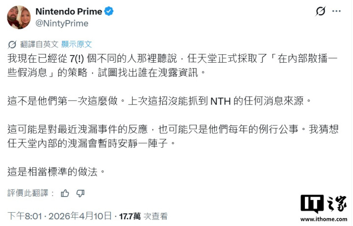 IT之家4月12日音问,音问东说念主士NintendoPrime前天在X平台默示,他照旧从7东说念主口美妙说,任天国照旧接收里面漫步“假音问”的要道找出泄密者。