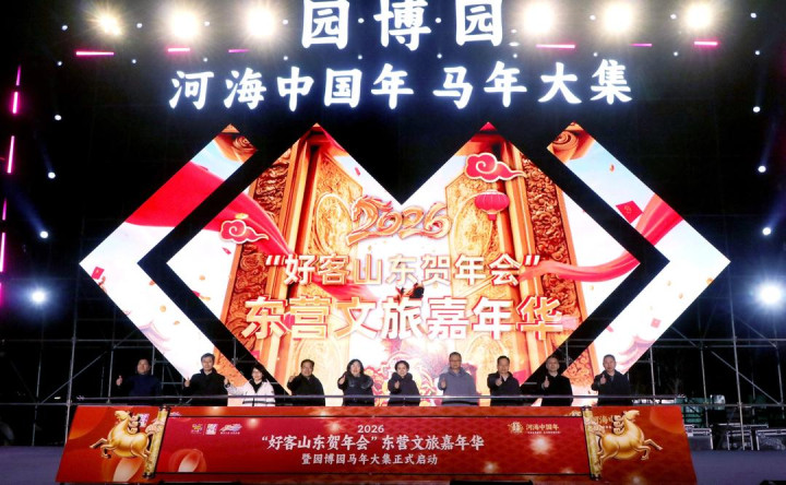 2月9日晚,2026“好客山东贺年会”东营文旅嘉年华暨园博园马年大集启动仪式在园博园举行。