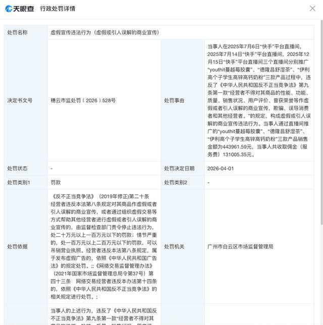 4月5日,他摆了一场声威庞大的拜师典礼,高调重返公众视线。而险些在归并时刻,一纸行政处罚书也悄然落地——辛巴实质结果的广州辛选供应链有限公司,因在直播间对优念念益旗下"youthit蔓越莓胶囊"等产物进行无理宣传,被广州市白云区阛阓监督惩办局罚金32万元。