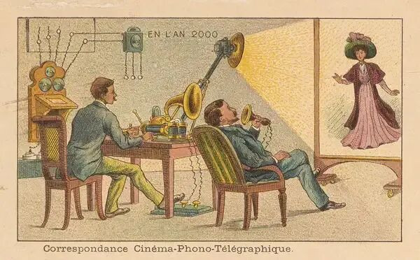 这是一百年前东谈主们联想的「视频通话」,受限于其时的本领,他们设计的决策是投影+留声机+电报: