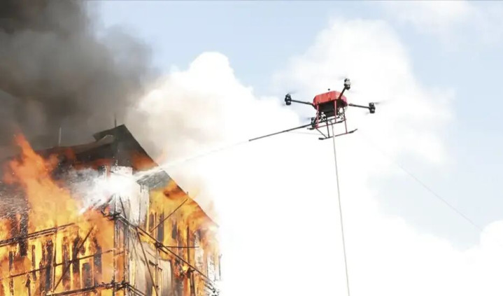 这是当今的「遨游消防员」,靠无东谈主机就能高空熄灭,仍是不需要真东谈主上去了: