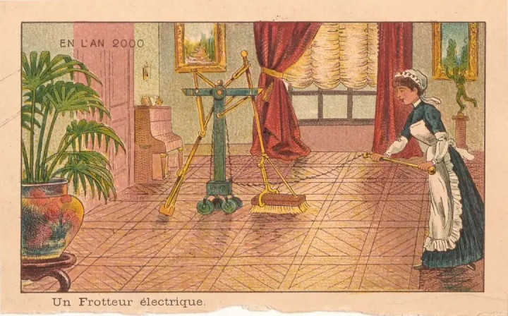 比如底下这张,这是一百年前东谈主们联想中的「扫地机器东谈主」,用轮子和连杆机构实现电动清扫: