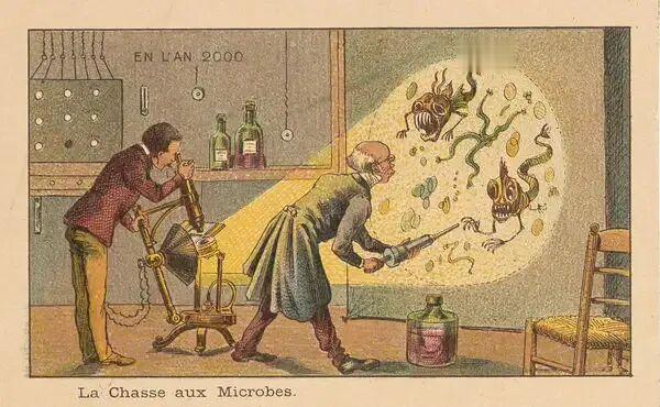 这是一百年前东谈主们联想的高清显微镜,其时仍是有光学显微镜了,但电子显微镜还没出现,是以他们设计的决策是把画面放大投影到墙上。
