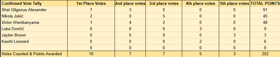 东契奇仅得回3张第四选票,杰伦-布朗得回3张第五选票,小卡得回2张第四选票。