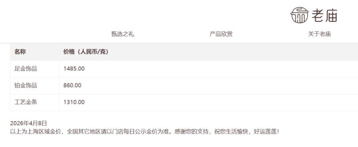 受此影响,国内品牌金饰价钱陆续大幅上调。记者8日查询发现,老庙黄金足金饰品报1485元/克,单日涨49元;周生生足金饰品报1471元/克,单日涨37元;老凤祥足金饰品报1470元/克,单日涨35元。