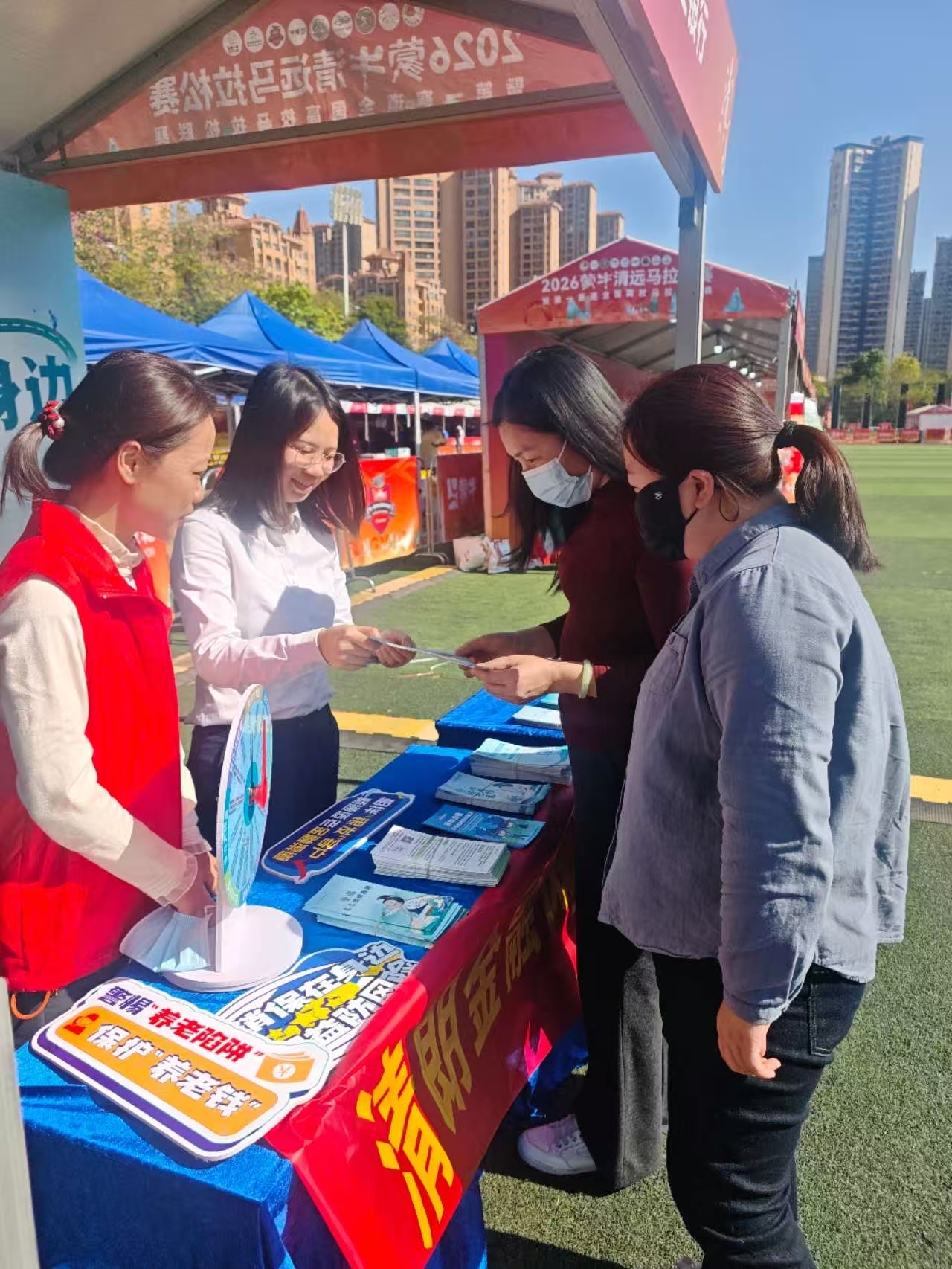 领物首日,位于清远市体育馆田径场农行清远分行的展位以“农行绿”为主色彩,盘算和会了马拉松畅通元素与金融安全标志,高出引东说念主留神。现场,责任主说念主员身披绶带或志愿者衣饰,向延绵链接前来领物的跑友披发宣传折页,要点围绕谨防电信麇集诓骗、远隔罪人集资、保护个东说念主信息安全、感性投资等当下热门畛域进行宣讲,搭建起了一个全方向的金融知识“补给站”。